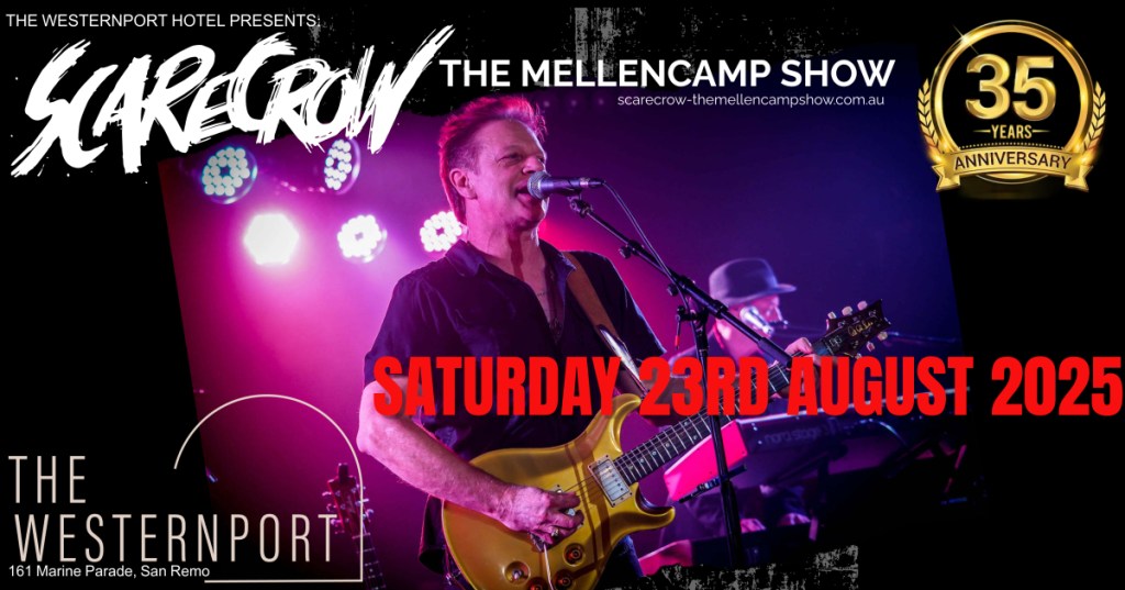 San Remo, it’s been a long while, but we’re looking forward to returning to The Westernport, what a great venue! Join us as we celebrate 35 years of bringing the heartland rock of John Mellencamp to life! Scarecrow – The Mellencamp Show is Australia’s premier tribute band, faithfully recreating the timeless hits and storytelling that made Mellencamp an icon. Don’t miss this unforgettable night of music, nostalgia, and celebration! Whether you’re a longtime fan or new to his artistry, this is a truly special night you won’t want to miss!