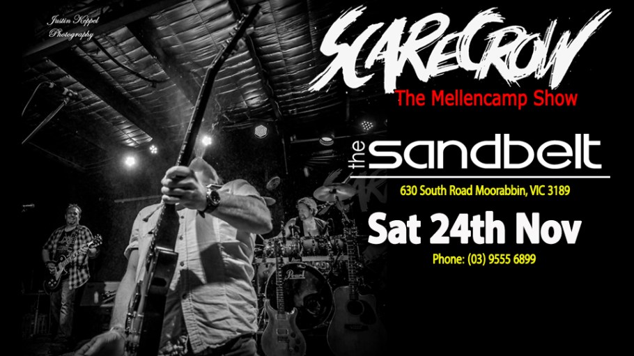 Musically authentic, visually electrifying and on a scale of one to ten, the energy meter is off the charts, if that sounds like your kind of night, then Scarecrow is absolutely right for you! High energy and great music is exactly what Scarecrow – The Mellencamp Show deliver & they’ll be doing just that next month at The Sandbelt Hotel. Put a call out to your fellow Mellencamp fans & head on down…